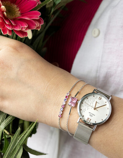 Ce bracelet 601600 unique et éclatant au mariage harmonieux entre l’argent et le Rose sera un vrai coup de cœur ! Il est un cadeau idéal à se faire à soi-même ou à offrir pour célébrer l’instant présent. Vous pourrez l’assortir au gré de vos envies à nos colliers et boucles d’oreilles .