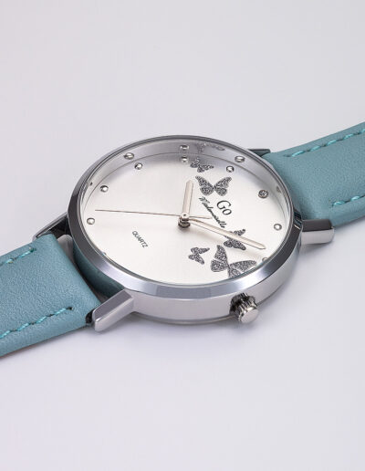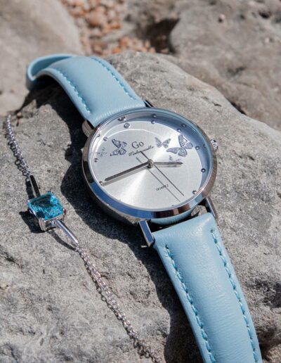 Difficile de résister au charme de notre montre Go Mademoiselle 699347 ! Symboles de délicatesse et de féminité, on remarque tout de suite les délicats petits papillons scintillants sur son cadran aux reflets soleillés argentés. Son boîtier affiche de douces lignes arrondies et ne dépasse pas 34 mm de diamètre. Il est relié à un bracelet à la douce couleur bleu clair. Surpiqué avec soin, ce dernier apporte une note tendance et colorée à l’ensemble avec son rendu mat ! Les trois fines aiguilles de notre montre Go Mademoiselle699347 indiquent l’heure avec clarté et précision,