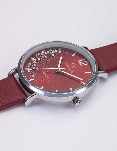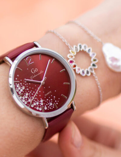 Féminine et raffinée, comment ne pas craquer pour notre montre Go Mademoiselle 699356 de la ligne G-24h ! Les jolis cristaux qui décorent son beau cadran bordeaux lui apportent lumière et éclat, à l’instar d’un scintillement d’étoiles au firmament ! Survolé par de fines aiguilles de couleur argentée, il est balayé par de doux reflets soleillés. Pour enlacer votre poignet avec une note colorée et élégante, le bracelet en cuir bordeaux de notre montre Go Mademoiselle 699356 vous accompagnera à chaque instant de votre journée !