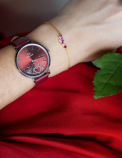 Cette création originale 699605 de notre collection de montres GO Mademoiselle ECLATS D’ETOILES est une invitation à contempler les constellations. Son ravissant cadran Rouge moyen est saupoudré d’une pluie d’étoiles. L’alliance entre un boitier aux courbes parfaites et un délicat bracelet Rouge moyen font de ce modèle un choix divin.