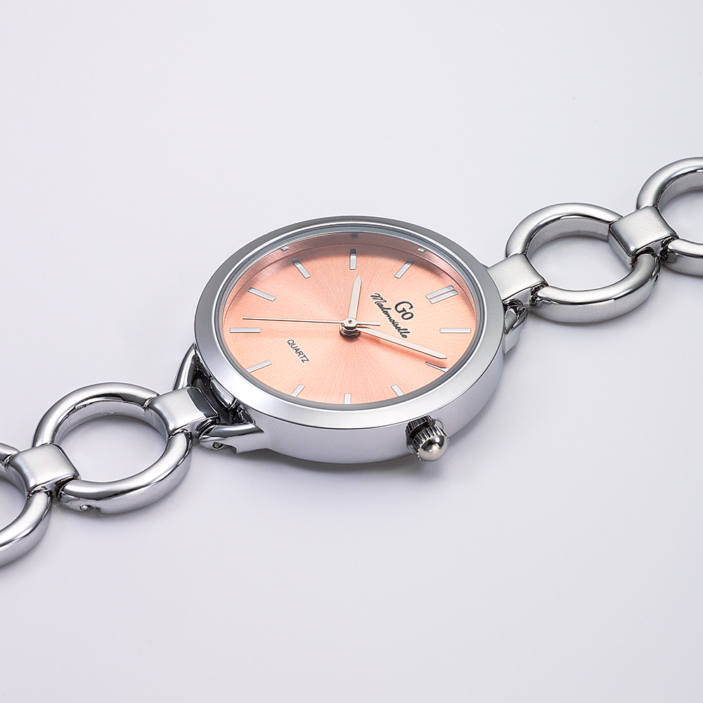Féminine et élégante, notre montre Go Mademoiselle 695215 est faite pour vous ! Au cur d’un boîtier de 30 mm de diamètre, se dévoile un délicat et lumineux cadran couleur rose pêche. Balayé par de jolis reflets soleillés, il est survolé en rythme par trois fines aiguilles de couleur argentée. Conçu pour entourer votre poignet avec délicatesse, le bracelet argenté de notre montre Go Mademoiselle 695215 est composé de jolies mailles ajourées !