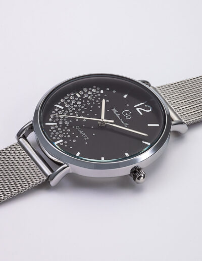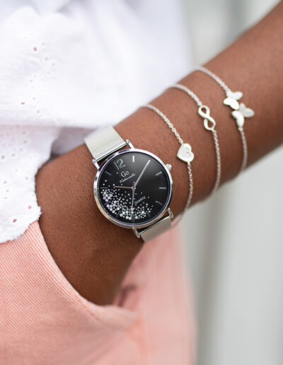 Chic et féminine, notre montre Go Mademoiselle 695350 de notre collection G-24h est faite pour vous plaire ! Au cur d’un joli boîtier rond de 36 mm de diamètre se niche un ravissant cadran noir partiellement orné de petits cristaux étincelants ! Ses trois aiguilles aux éclats argentés vous indiquent l’heure avec clarté et contraste. Pour venir enlacer votre poignet avec élégance, notre montre Go Mademoiselle 695350 opte pour un acier milanais tout à fait dans l’air du temps !