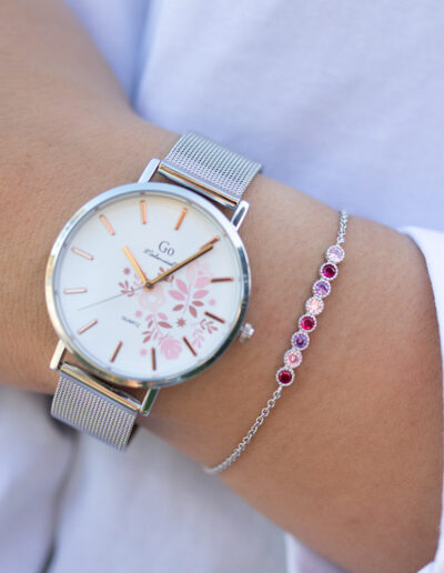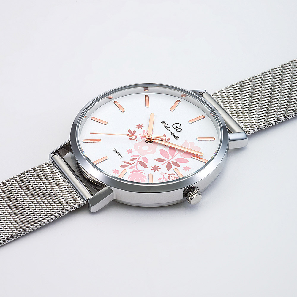 Difficile de ne pas craquer pour cette ravissante montre Go Mademoiselle 695910 ! Au cœur d’un boîtier rond de couleur argentée de 36 mm de diamètre se niche un magnifique cadran blanc décoré de jolies fleurs aux teintes rosées. Chic et féminin, il est survolé par de fines aiguilles rose gold et orné d’une ronde d’index qui indiquent l’heure avec clarté ! Enlaçant votre poignet avec style, le bracelet en acier milanais de notre montre Go Mademoiselle 695910 complétera toutes vos tenues !