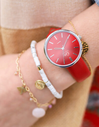 De rouge passion vêtue, notre montre Go Mademoiselle 699315 va vous faire chavirer ! Au cœur d’un boîtier arrondi de couleur argentée de 34 mm de diamètre se niche un séduisant cadran rouge. Balayé par de jolis reflets soleillés, il indique l’heure avec une grande clarté grâce à ses trois aiguilles à l’éclat argenté. Pour vous accompagner au quotidien, le délicieux bracelet rouge de notre montre Go Mademoiselle 699315 se veut coloré et pétillant !