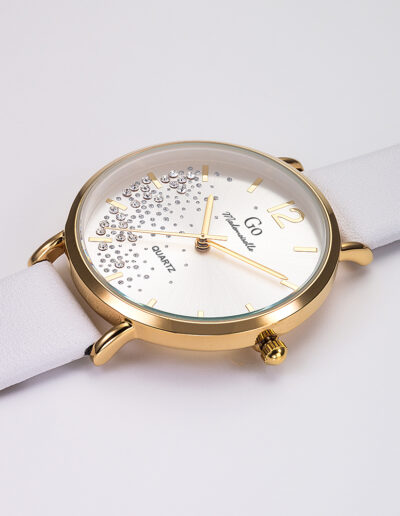 Notre montre Go Mademoiselle 699359 à la silhouette chic et raffinée est un must have ! Son boîtier de 36 mm de diamètre affiche un joli arrondi et s’habille d’un lumineux éclat doré, tout comme ses index et ses fines aiguilles qui indiquent l’heure avec clarté. Balayé par de subtils reflets soleillés, son cadran de couleur argentée est délicatement décoré de petites pierres qui apportent une note de féminité et de lumière à son ensemble. Pour enlacer votre poignet avec élégance, le bracelet de notre montre Go Mademoiselle699359 de la collection G-24h est conçu en cuir d’un blanc lumineux !