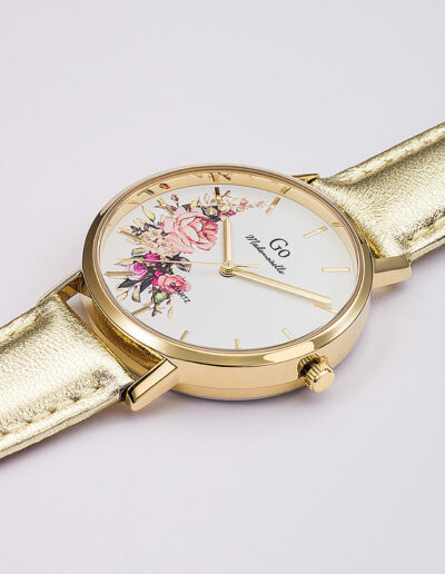 Un brin de candeur et un soupçon d’audace pour cette ravissante création 699595 de notre collection de montres GO Mademoiselle FLEURS ET PAPILLONS. Elle saura vous émerveiller par la beauté naturelle de son cadran Blanc orné de ravissants motifs. Elle est l’accord délicat entre un boitier aux courbes équilibrées en Métal-Doré et un magnifique bracelet Doré.
