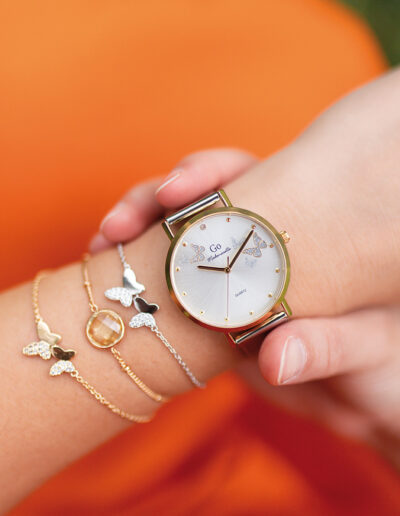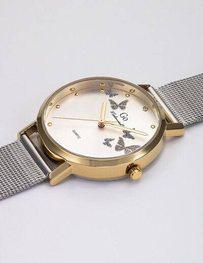 Notre montre Go Mademoiselle 695362 à la silhouette bicolore se démarque par son originalité ! Son boîtier rond de 34 mm de diamètre et son ravissant bracelet en acier milanais mêlent avec bonheur couleur dorée et argentée. Ils contribuent à apporter une touche tendance et chic au modèle ! Grâce à ses jolis reflets soleillés et à la pierre qui trône à midi, son cadran de couleur argentée survolé d’étincelants petits papillons ne passe pas inaperçu. Les trois aiguilles aux éclats dorés de notre montre Go Mademoiselle 695362indiquent l’heure avec une clarté inégalée !
