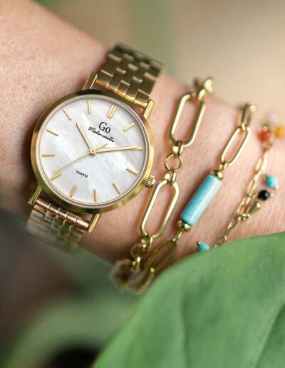 Avec sa silhouette élégante, notre montre Go Mademoiselle 695371 vous accompagnera à chaque occasion ! Vous serez séduite par le look actuel de son boîtier de couleur dorée de 30 mm de diamètre. Son bracelet en acier est composé de jolis maillons dont l’éclat doré apporte une touche féminine et élégante à l’ensemble. La teinte blanche nacrée du cadran de notre montre Go Mademoiselle 695371 illuminera votre poignet de ses effets irisés !