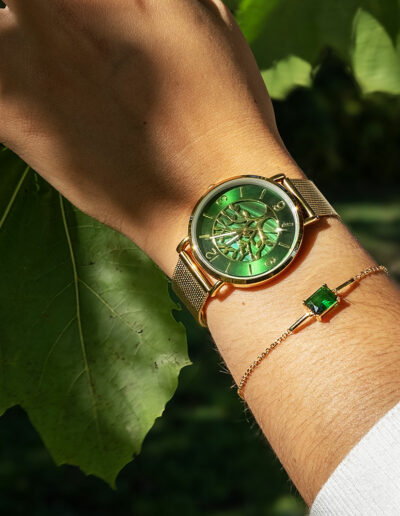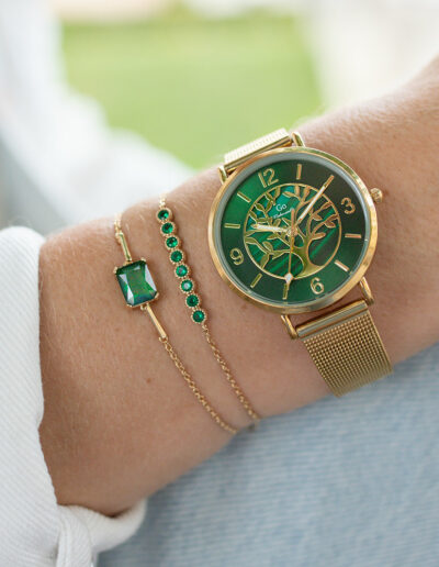 Cette élégante création 695539 de notre collection de montres GO Mademoiselle ARBRE DE VIE s’inspire des essences et des charmes de la nature. Elle saura vous accompagner dans tous vos précieux moments. Faites une pause… et admirez son cadran Vert foncé délicatement ciselé de ce symbole universel de protection, de sagesse et d’éternité. Ce mariage harmonieux entre un boitier aux douces courbes et un délicat bracelet Doré vous fera succomber !