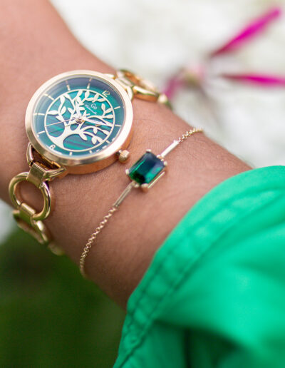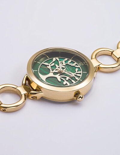 Cette élégante création 695557 de notre collection de montres GO Mademoiselle ARBRE DE VIE s’inspire des essences et des charmes de la nature. Elle saura vous accompagner dans tous vos précieux moments. Faites une pause… et admirez son cadran Vert foncé délicatement ciselé de ce symbole universel de protection, de sagesse et d’éternité. Ce mariage harmonieux entre un boitier aux douces courbes et un délicat bracelet Doré vous fera succomber !