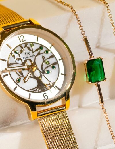 Cette élégante création 695571 de notre collection de montres GO Mademoiselle ARBRE DE VIE s’inspire des essences et des charmes de la nature. Elle saura vous accompagner dans tous vos précieux moments. Faites une pause… et admirez son cadran Argenté & nacré délicatement ciselé de ce symbole universel de protection, de sagesse et d’éternité. Ce mariage harmonieux entre un boitier aux douces courbes et un délicat bracelet Doré vous fera succomber !