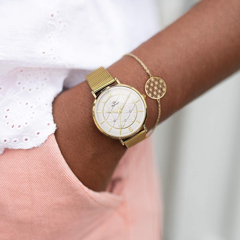 Un brin de candeur et un soupçon d’audace pour cette ravissante création 695594 de notre collection de montres GO Mademoiselle FLEURS ET PAPILLONS. Elle saura vous émerveiller par la beauté naturelle de son cadran Blanc argenté orné de ravissants motifs. Elle est l’accord délicat entre un boitier aux courbes équilibrées en Métal-Doré et un magnifique bracelet Doré.