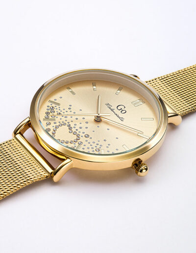 Cette création originale 695603 de notre collection de montres GO Mademoiselle ECLATS D’ETOILES est une invitation à contempler les constellations. Son ravissant cadran Champagne est saupoudré d’une pluie d’étoiles. L’alliance entre un boitier aux courbes parfaites et un délicat bracelet Doré font de ce modèle un choix divin.