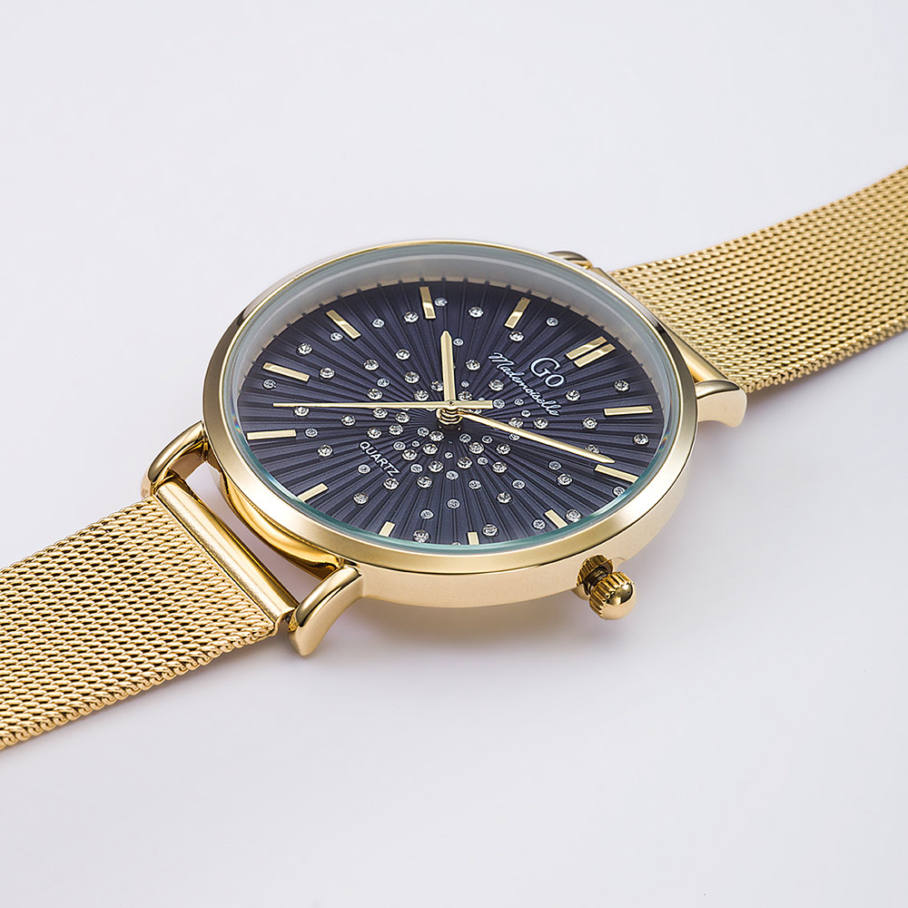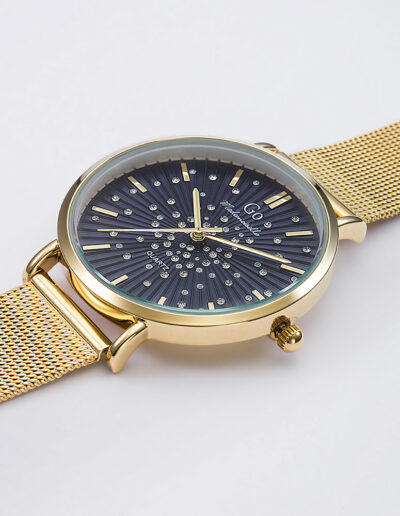 Cette création originale 695638 de notre collection de montres GO Mademoiselle ECLATS D’ETOILES est une invitation à contempler les constellations. Son ravissant cadran Bleu foncé est saupoudré d’une pluie d’étoiles. L’alliance entre un boitier aux courbes parfaites et un délicat bracelet Doré font de ce modèle un choix divin.