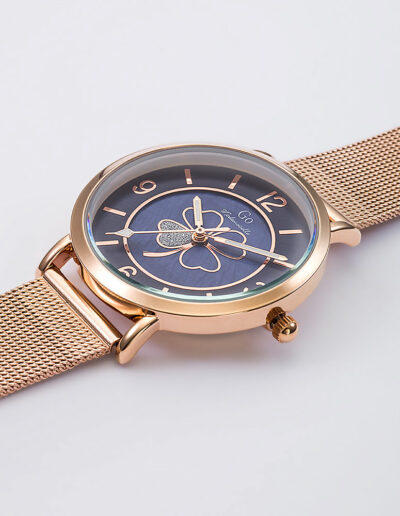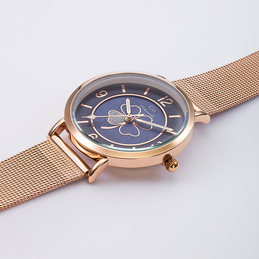 Un brin de candeur et un soupçon d’audace pour cette ravissante création 695644 de notre collection de montres GO Mademoiselle FLEURS ET PAPILLONS. Elle saura vous émerveiller par la beauté naturelle de son cadran Bleu moyen orné de ravissants motifs. Elle est l’accord délicat entre un boitier aux courbes équilibrées en Métal-Doré rose et un magnifique bracelet Doré rose.